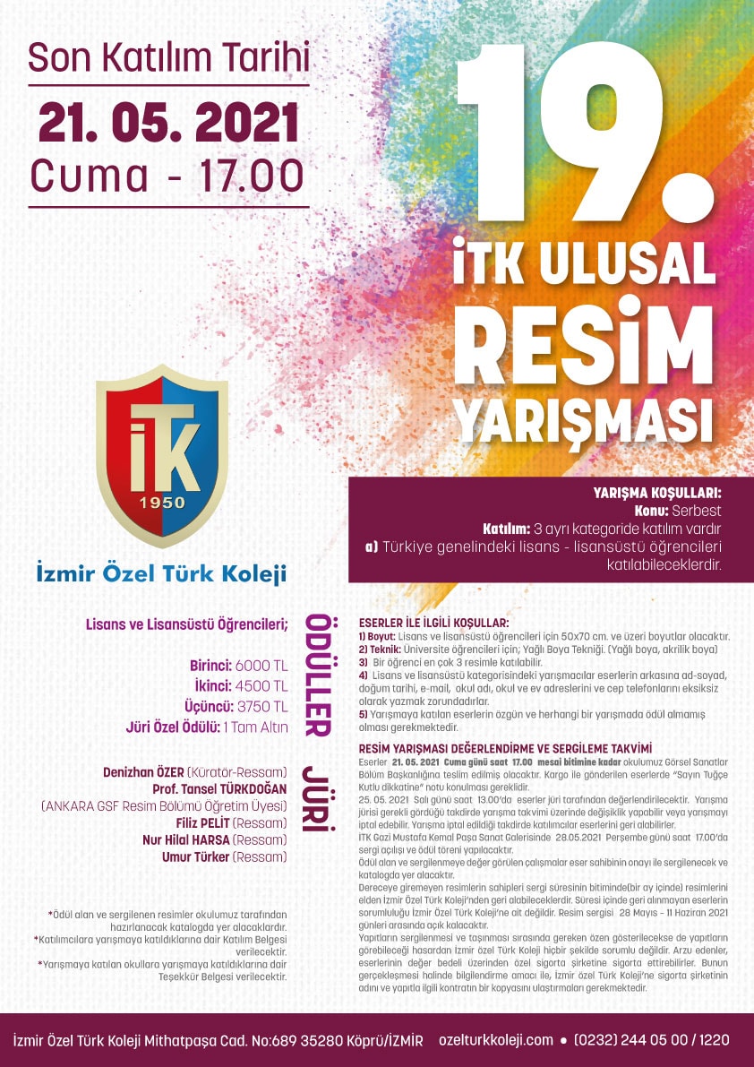 İzmir Özel Türk Koleji, 2020-2021 Eğitim ve Öğretim yılında Türkiye genelindeki Ortaokul, Lise ve dengi okullar ile Lisans-Lisansüstü öğrencilerini kapsayan “Geleneksel İTK Ulusal Resim Yarışması” nın 19.’si düzenlenmektedir.
