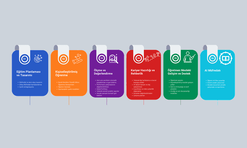 Bu yaklaşım sayesinde AI kullanımını 6 ana başlık altında ele alır ve eğitim-öğretim çalışmalarına destekleyici bir unsur olarak anlamlı bir şekilde entegre etmeye çalışırız.