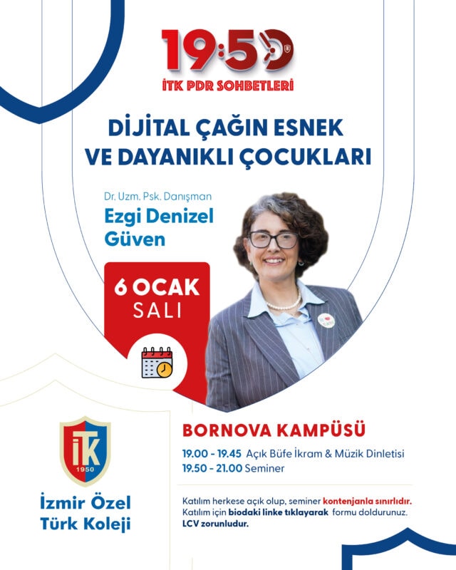 Velilerimizin psikolojik iyi oluşunu desteklemek amacıyla her yıl belirli periyotlarda düzenlediğimiz 19.50 Psikoloji Buluşmaları, alanında uzman psikologların katılımıyla beş kampüsümüzde gerçekleştirilmektedir. Saat 19.50’de başlayan bu buluşmalarda; çocuk ve ergen gelişimi, aile içi iletişim, psikolojik dayanıklılık gibi pek çok güncel konu ele alınmakta, katılımcılara bilimsel ve uygulanabilir bilgiler sunulmaktadır.